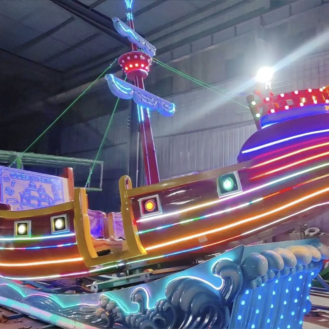 The drifting pirate ship is composed of a rectangular track placed on the ground and an antique pirate ship sliding on the track. The pirate ship cockpit has a novel appearance, and the splashes of water that resemble waves are lifelike, making people feel as if they are in the sea. The antique pirate ship cockpit is brightly colored, rich in details, and the overall appearance is domineering and the lights are gorgeous, especially at night.