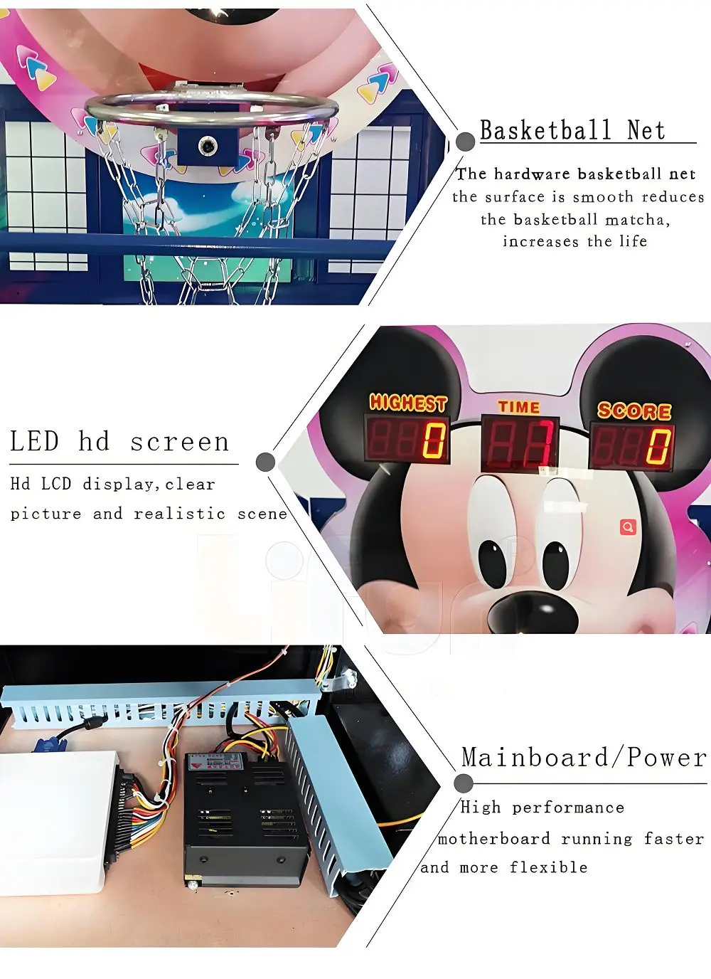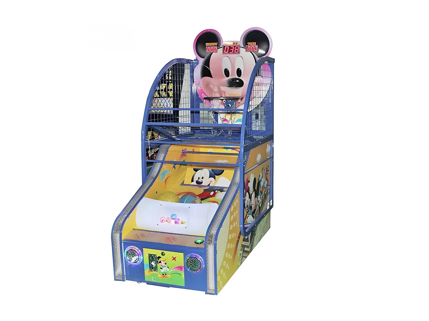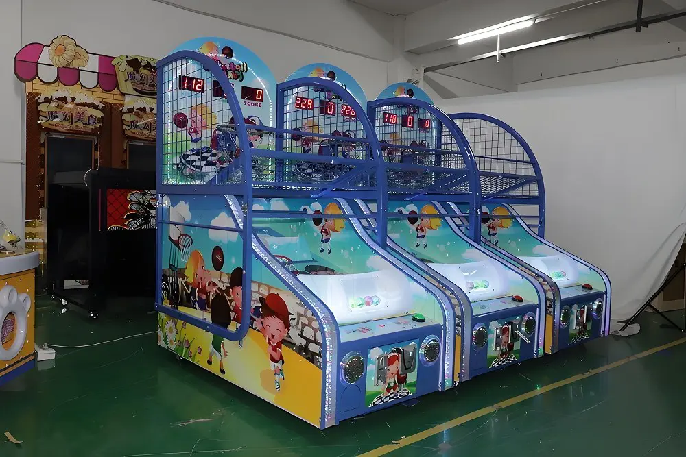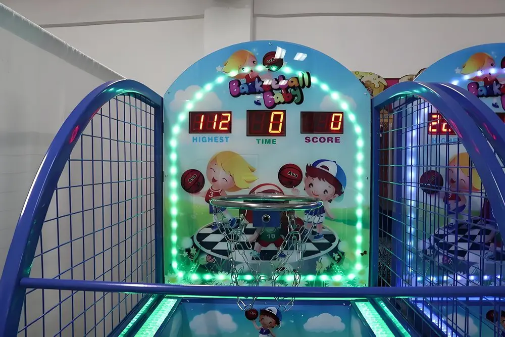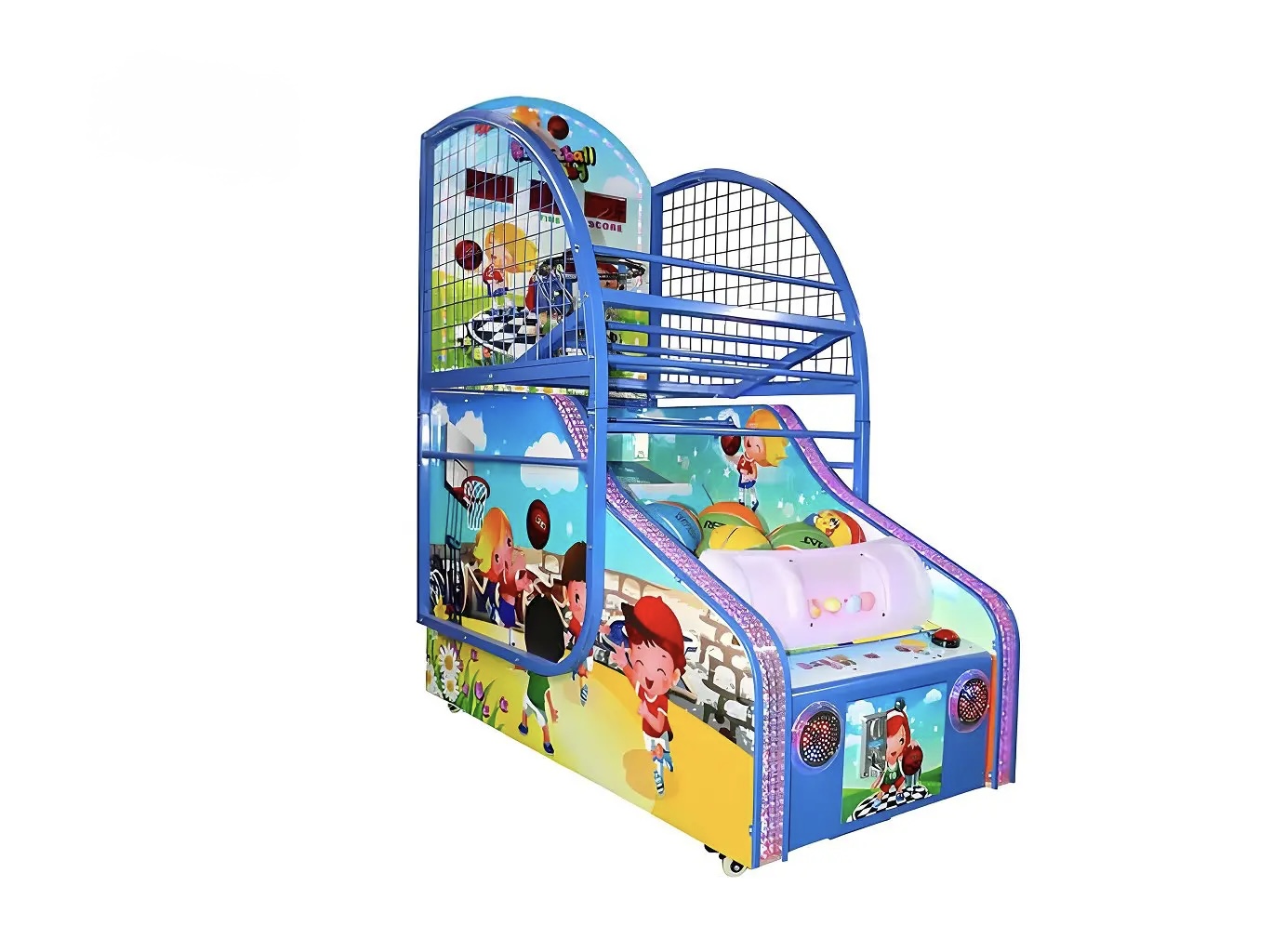 Designed for children, this colorful basketball arcade machine features fun music, LED lighting, ticket rewards, and a kid-friendly height—perfect for indoor playgrounds, family entertainment centers, and arcades.