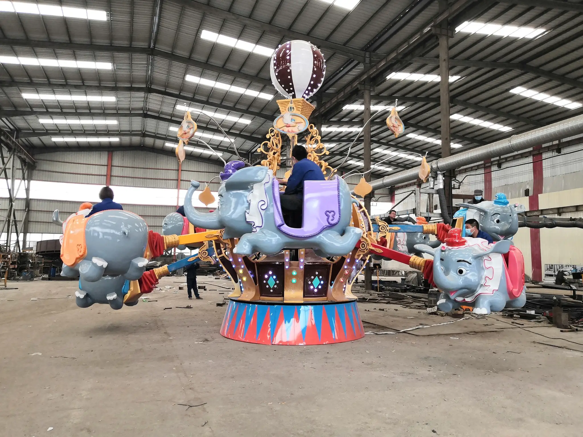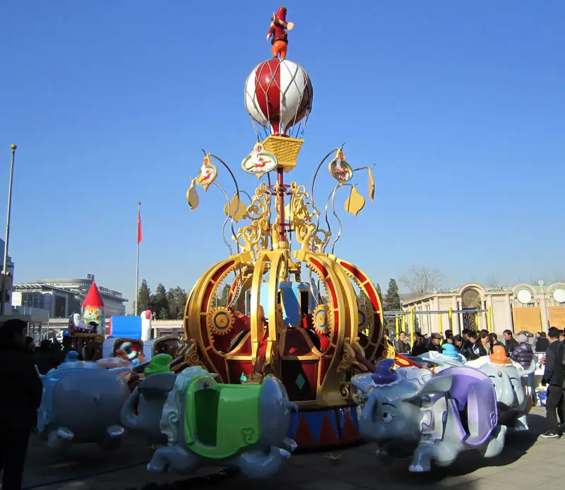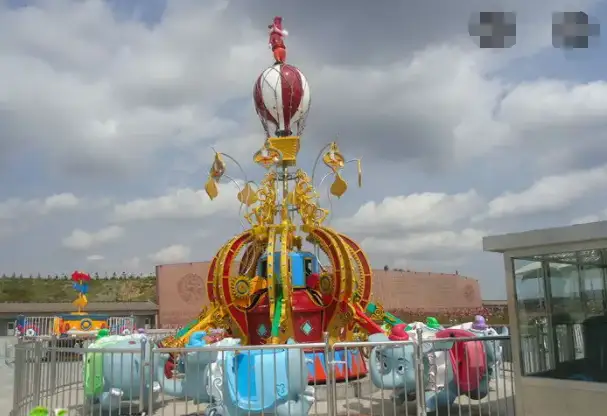 he Self – Controlled Divine Flying Elephants is a charming amusement ride. It features an elephant – themed design, with several cute elephant – shaped carriages that are vividly crafted. Riders can control the elevation of their own elephant carriages, adding an interactive element to the experience. The central structure is decorated with intricate patterns and a hot – air – balloon – like top, enhancing the whimsical atmosphere. As the ride rotates, the elephants seem to fly around, creating a delightful and immersive experience for riders, especially appealing to children who love the fun and control of this unique attraction.